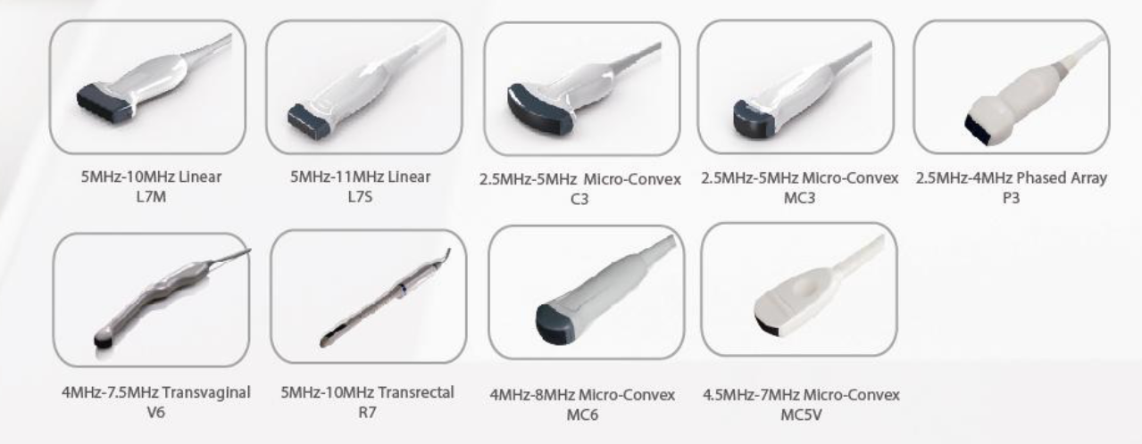 - Other probes available: C3 convex probe 3.5MHz, L7M linear probe 7.5MHz, L7S linear probe 9.0MHz, MC5V micro-convex probe 5.0MHz, MC6 micro-convex probe 6.0MHz, P3 phase probe 3.0MHz, L7V linear probe 7.5MHz